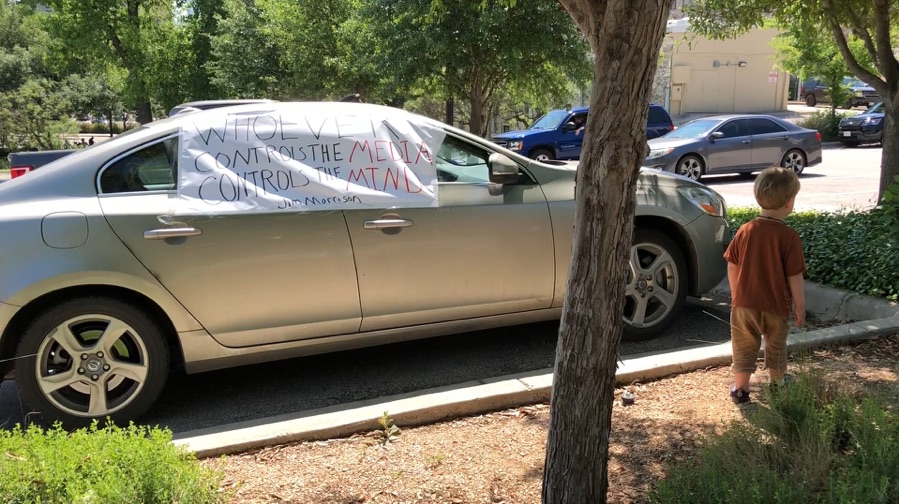 A small child walks past the car with a Jim Morrison’s quote, “Whoever controls the media controls the mind.” A black king cab labeled “INFOWARS IS FORBIDDEN INFORMATION” is parked behind.