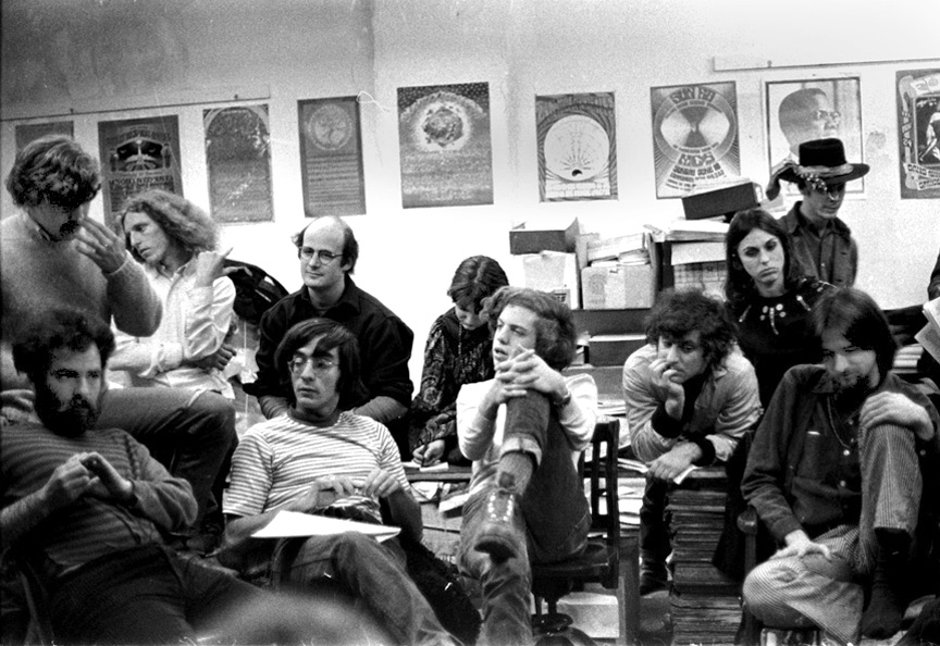 Yippie Summit in NYC. First row (left to right): Jerry Rubin, Abe Peck, David Fenton, Abbie Hoffman, Jim Retherford. Second row (left to right): Ed Sanders, Super Joel, Martin Kenner, Nancy Kurshan, Anita Hoffman, Tom Forcade. Photo by Leni Sinclair.