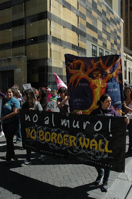 Graciela Sanchez of the Esperanza Peace and Justice Center, her mother, Isabel Sanchez, two women from Fuerza Unida, and a former councilwoman carried the leadoff banner for the march. Other banners and signs displayed the diversity of causes and issues, calling for an end to NAFTA and to war, defending immigrant rights and decrying the border wall.
