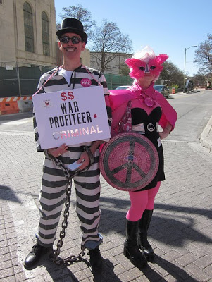 The march did not disappoint. A blustery wind whipped against our banner, “Women Say No to War,” when we left from the Grand Hyatt on Saturday, March 3. But the wind died down as we made the now familiar trek to Milam Park and the Plaza del Zacate. CodePink Austin invoked various “Supershero powers” as the contingent marched in costumes, adorned with capes and crowns, and accompanied by a prison-garbed and shackled “war criminal.”