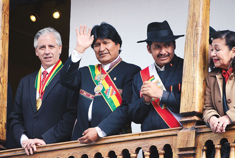 President Evo Morales — with Vice President Álvaro García Linera and Esteban Urquizu, governor of Chuquisaca, on Independence Day in Sucre, Bolivia. Photo from La Razon.