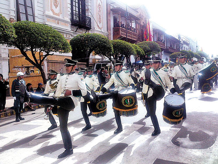 Police marching band does a little goose-stepping on Independence Day in Sucre. Photo from La Razon.