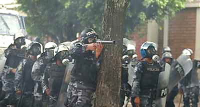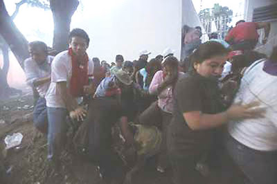Beginning early Monday, helicopters circled over the embassy and police surrounded the zelayistas but matters became more serious later when the de facto government announced a curfew throughout the country from 4:00 that afternoon until 7:00 the next morning. Some left and some stayed, vowing to spend the night outside the embassy. Around 4:00 Tuesday morning, with around 500 demonstrators still at the embassy, the police moved in with tear gas, water cannons, rubber bullets, pepper spray and, according to some, live ammunition. An unknown number were arrested, many were injured.