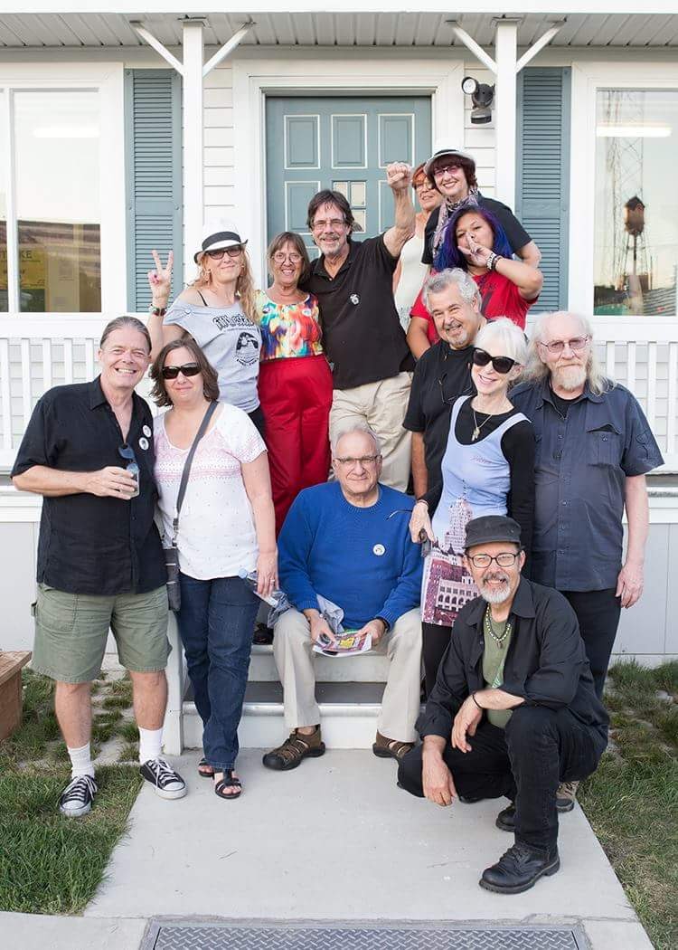Former Fifth Estate staffers, supporters, and reunion organizers. In the back with raised fist is Peter Werbe; to his left is Leni Sinclair and to his right, Laura Grimshaw; and seated, in blue sweater, is the paper’s founder, Harvey Ovshinsky.