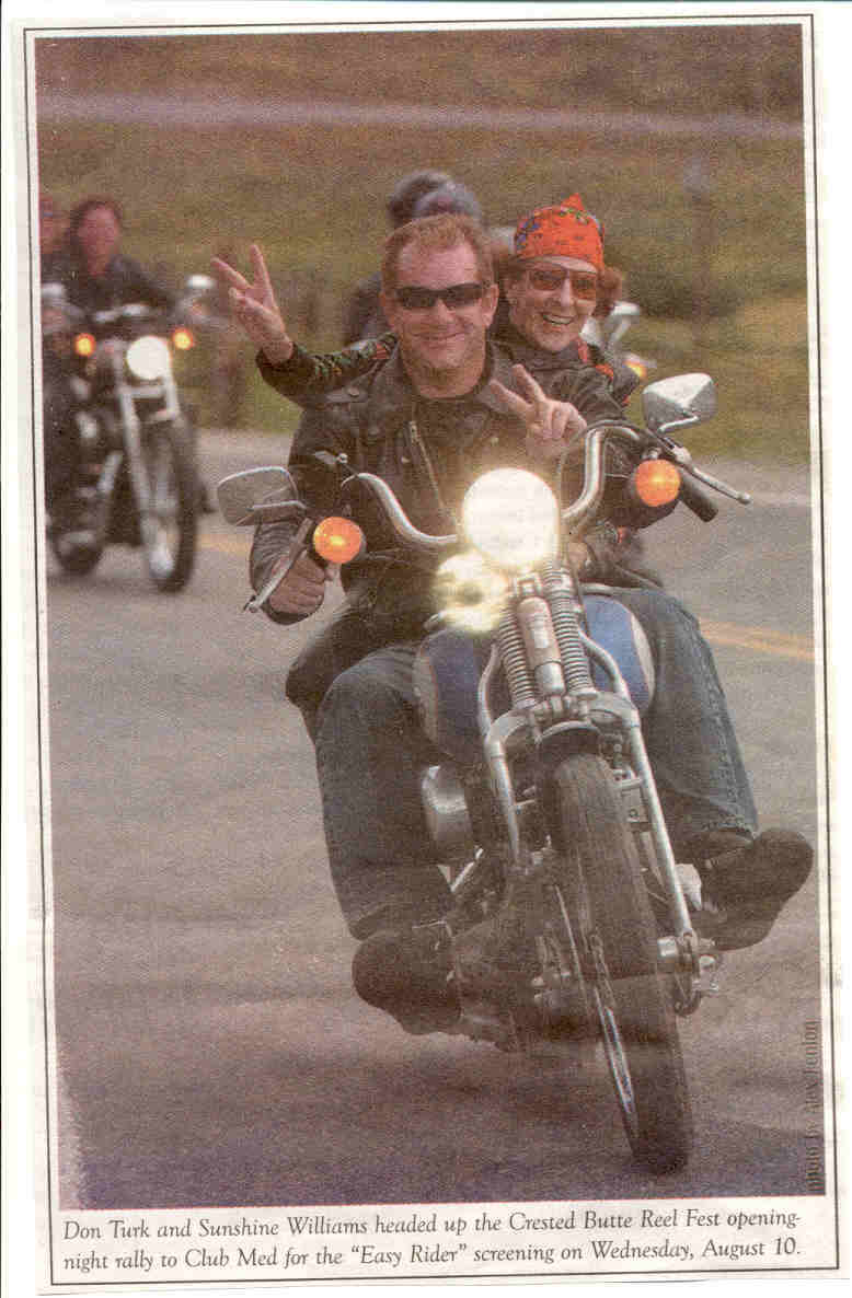 The author knows from “Bad Boys.” Here Sunshine is hitching a ride to Mount Crested Butte in Colorado for a film festival honoring bad boy flick, Easy Rider. Photo from the Crested Butte News, August 10, 2005.
