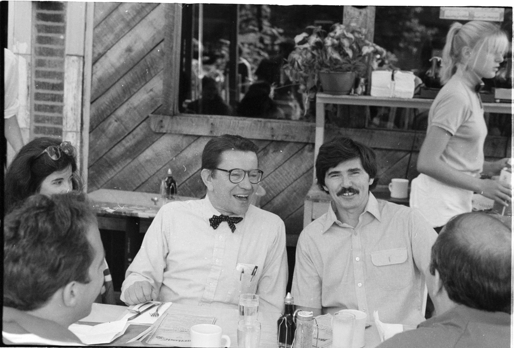 Congressman (soon to be Senator) Paul Simon meets with progressive 49th Ward Alderman David Orr and others at the Heartland Cafe.