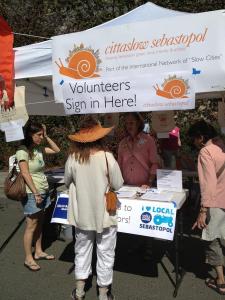 Among the VBC’s many sponsors are the following: Transition Sebastopol, dedicated to “building community resilience”; Cittaslow Sebastopol, which indicates that the town qualifies as one of a growing number of “slow cities” around the globe; the Grange, an agriculture-based group which has existed for nearly 150 years, since the 1880s in Sebastopol; and The Barlow, a collection of local merchants along a street that was painted by volunteers.