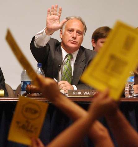 Texas Sen. Kirk Watson at public meeting on toll roads in Austin, September 2007. Photo by Kelly West, Austin American-Statesman.