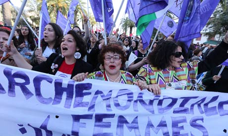 | Contingent of women participating in three-hour march to kick off World Social Forum in Tunis in the last week of March 2013. Photo by Mohamed Messara / EPA / Guardian. |