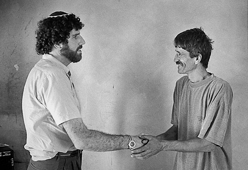 Other Scenes: Shaking Hands, Palestine, 1998. Rabbi Arik Ascherman, co-director of Rabbis for Human Rights, shakes hands with Atta Jabber in Atta’s home near Hebron. Rabbi Ascherman often goes to visit Palestinians who have received home demolition orders in order to offer his moral support and sometimes to be arrested peacefully opposing such disrespect for his fellow human beings. Photo by Alan Pogue / The Rag Blog.