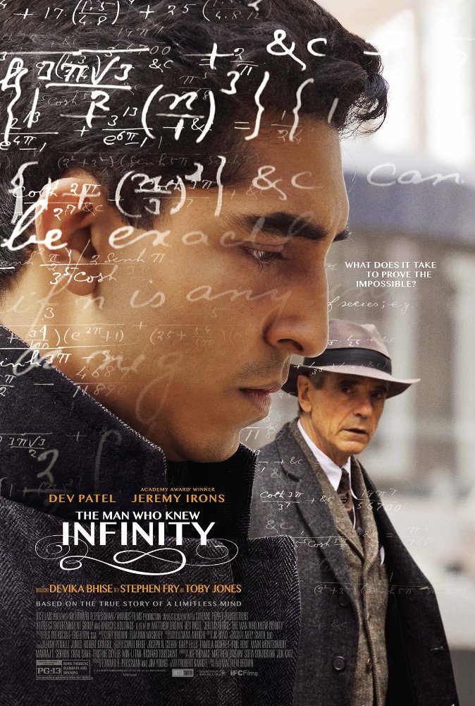 looking for great ideas for the U.S. to steal and finds lots of them, but lo and behold, they were all originally our ideas… until someone else carried them out. Most countries’ prisons are bursting with drug criminals, but not Portugal’s, because they legalized drugs 15 years ago. When Wall Street trashed our economy in 2007, only one man (with an Arab surname) went to prison. In Iceland, which had a female head of government, when 80 bankers ripped off the economy, she sent all 80 of them to prison. In this film, Moore learns that Italian workers get eight weeks paid vacation a year, have more sex than us, and live an average of four years longer than us. Children in poor French schools are served healthy two-hour lunches. Students in 20 lands go to free college and have no college debt. The best-educated high schoolers in Europe (Finland’s) have no homework or standardized tests. The sensible ideas just go on and on. If you missed this brilliant film, shame on you. It’s still on DVD and Netflix discs! - THE MAN WHO KNEW INFINITY (U.K.) is a beautiful, moving true story of a poor, brilliant Madras, India, clerk, Srinivasa Ramanujan (Dev Patel) who journeys to Cambridge University in England in the 1910s to study with leading mathematician G. H. Hardy (Jeremy Irons) and hopefully to get his radical theories published. There he encounters hidebound rules, racial prejudice, violence, and poor health, while back in India his mother schemes to keep him and his loving wife apart. This is a wonderful, wonderful movie, and the factual crawl just before the credits is mind-blowing! 97.2% of the 22,963 viewers who rated it at imdb.com gave it thumbs up.
