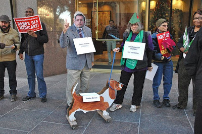 As part of nationwide protests that coincided with International Human Rights Day, union members, MoveOn, and citizens who want to protect Social Security, Medicare, and Medicaid, made their message to Senator Cornyn clear with a “Candlelight Campaign against Cuts.” There were also demonstrations in Dallas, Austin, Corpus Christi, Laredo, San Antonio, and Houston suburb Sugar Land.
