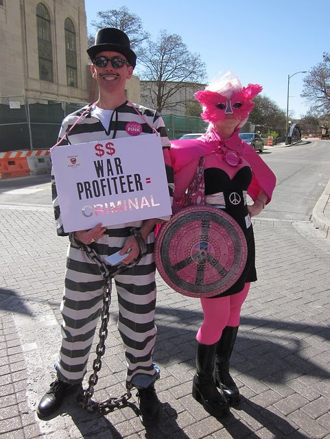 The march did not disappoint. A blustery wind whipped against our banner, “Women Say No to War,” when we left from the Grand Hyatt on Saturday, March 3. But the wind died down as we made the now familiar trek to Milam Park and the Plaza del Zacate. CodePink Austin invoked various “Supershero powers” as the contingent marched in costumes, adorned with capes and crowns, and accompanied by a prison-garbed and shackled “war criminal.”