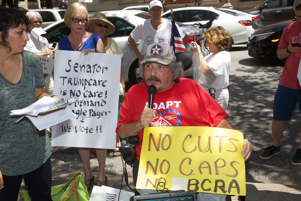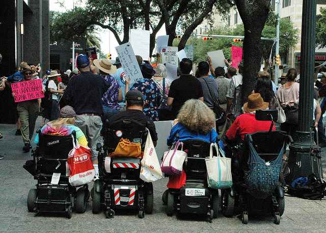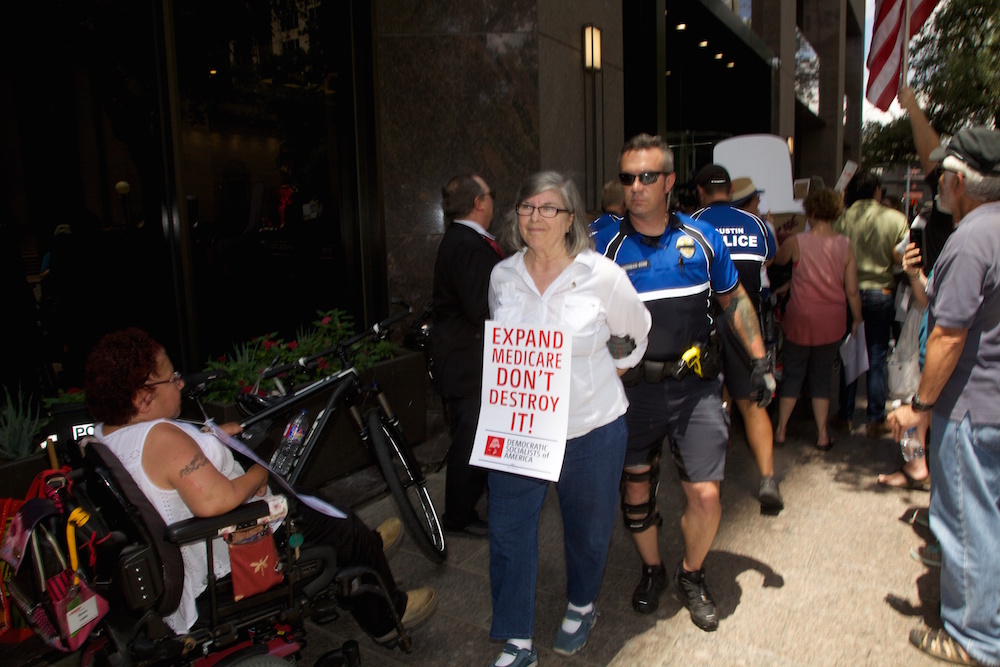 With Congress on recess, a number of groups issued a call to action. Responding to this, a coalition in Austin included the Democratic Socialists of America (DSA) in Austin, Our Revolution Central Texas, the Texas Alliance for Retired Americans (TARA) Austin, Left Up to Us (a Bernie Sanders-inspired local group), ADAPT Austin (fearless advocates for disability rights) and Indivisible Austin. Similar protests and actions took place across the nation with civil disobedience in at least 22 states.