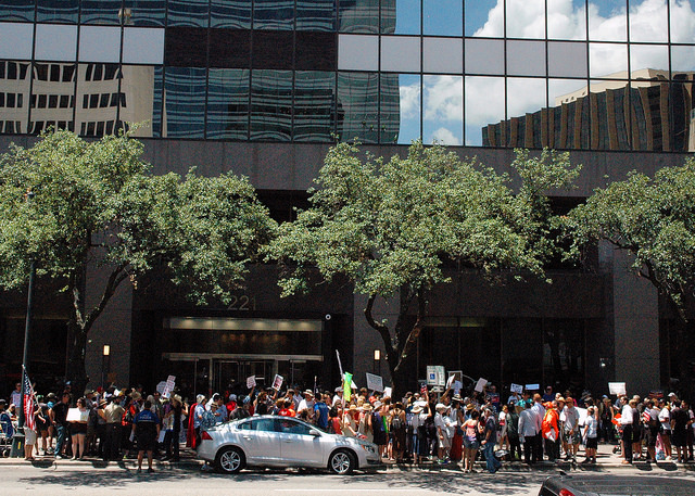 Later in the day, after the noon event at Cornyn’s office, an even larger group of protestors mobilizaed outside the Renaissance Hotel at Texas Sen. Ted Cruz’s scheduled event. No civil disobedience was planned and no arrests were made.
