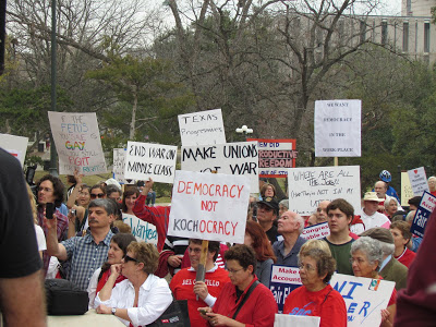 Good article, Alice. I missed some of the signs you describe. I was really impressed with the turn out, the way the groups joined in one loud protest against the Republican war on women and labor, not just in Texas and Wisconsin but as the subtext of a larger effort to create havoc in American society so they can blame it on Obama come 2012. I believe that Karl Rove is behind it.