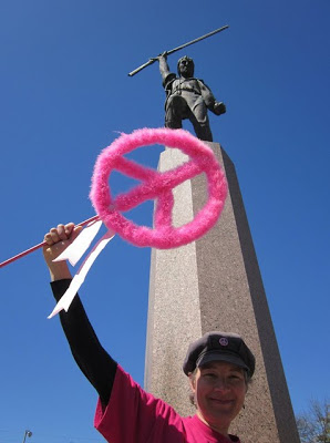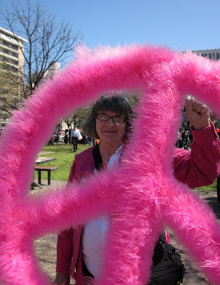 Peeking through the pink peace symbol above is The Rag Blog‘s Alice Embree.