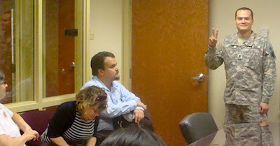 Victor Agosto, immediately prior to his Court Martial at Fort Hood, Texas. Seated on left is Agosto’s civilian attorney, James Branum. Photo by Cynthia Thomas / The Rag Blog.
