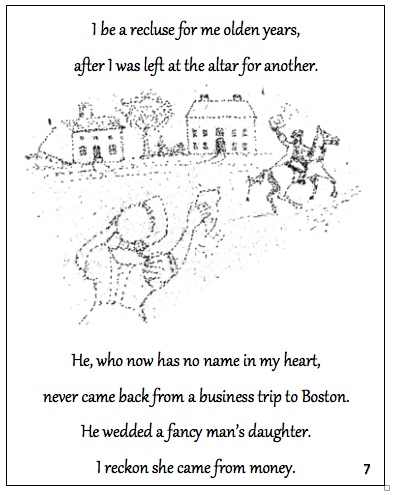 I be a recluse for me olden years, after I was left at the altar for another. He, who now has no name in my heart, never came back from a business trip to Boston. He wedded a fancy man’s daughter. I reckon she came from money.