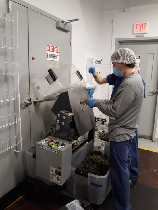 All of the grow rooms are “feminized,” Kevin explained, so searching for male plants — and removing them — is one of the necessary steps. Once mature, after several months of growth, the plants are dried and then the buds are removed by hand and by machine. As required by the state, samples are sent to outside labs for a variety of tests. Many of the buds are packaged for resale to retail dispensaries. Some are sold to other enterprises for processing. I saw workers putting buds into a small package containing 3.5 grams and labeled “Banana Daddy” as the variety and Ozone as the brand name.