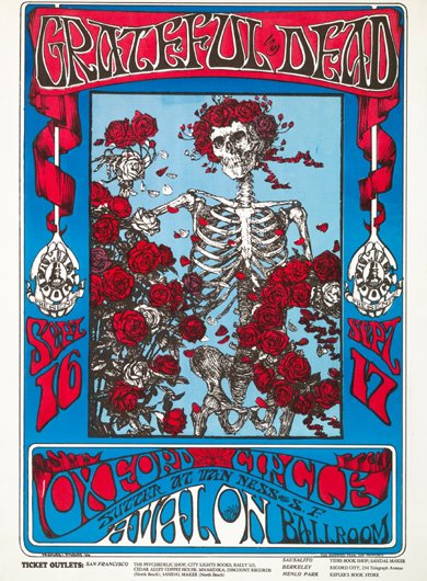 Mr. Kelley and his longtime collaborator, Stanley Mouse, combined sinuous Art Nouveau lettering and outré images plucked from sources near and far to create the visual equivalent of an acid trip. A 19th-century engraving from “The Rubaiyat of Omar Khayyam” inspired a famous poster for a Grateful Dead concert at the Avalon Ballroom in 1966 that showed a skeleton wearing a garland of roses on its skull and holding a wreath of roses on its left arm.