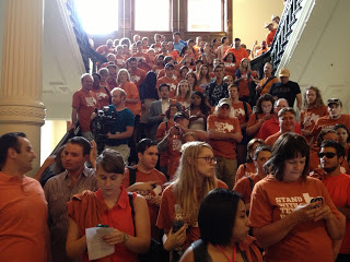 I leave it to my friends who know more about Texas traditions to explain some of the more sadistic rules of decorum in the Senate chambers, which includes the need for Depends. Having stood in line for three hours followed by an hour and a half in a Senate Gallery seat, considering what might happen if I peed in the Gallery, I could stand it no longer and removed myself to the Rotunda where facilities awaited. So did the largest, most energetic, and by far noisiest indoor rally I’ve ever seen.