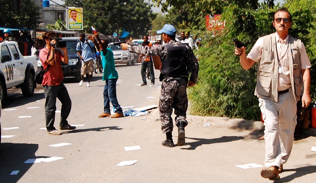 The scene is a protest last week in Port-au-Prince. The guy on the left is a clearly unarmed and videotaping journalist from Texas named Ansel Herz, whom I happened to work with when I was in Haiti last month. The uniformed fellow pointing a gun directly at his face is a United Nations peacekeeper.