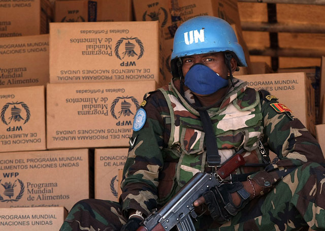 Above, MINUSTAH soldier points his gun at former Austin activist/independent journalist Ansel Herz in Port-au-Prince, Haiti, on October 15, 2010, at a demonstration against the renewal of MINUSTAH, the UN peackeeping mission. Photo from Gaentantguevara / Flickr.