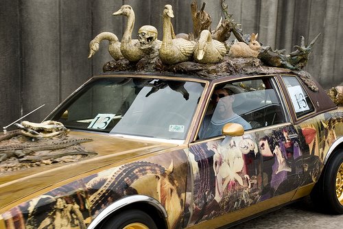 There was an orange tree from the Orange Show Center for Visionary Art, which organizes the Art Car Parade. And there were pieces from Saturday’s crop of Art Cars: a plastic hamburger, a Buddha statue and a mounted animatronic bass bearing the inscription, “Tom, we remember your laughter.”