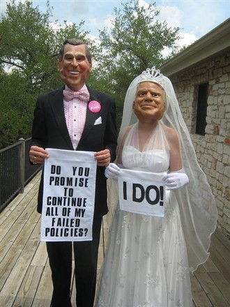 CodePink activists had come from around the country to bring their trademark color, humor and street theatre to the RNC, including beautiful large puppets created especially for the events. Heidi and Jim as a McCain/Bush wedding couple were a popular draw for the cameras. “We were the only bride and groom there!,” Heidi said. Because she and Jim were wearing Bush and McCain masks (hard to talk when you are wearing a rubber mask!), they had prepared press cards to hand out, and she said they distributed about 80 of their cards to journalists who approached them.