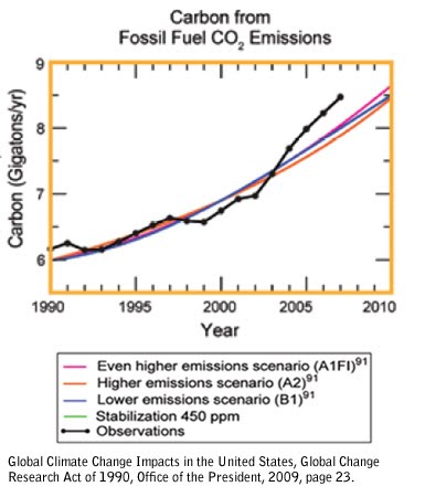 The next graphic shows the atmospheric load of carbon dioxide (as carbon) in gigatons, from the USGCRP Report. The colored lines are the computer model’s projections. The black line with the circles shows actual atmospheric measurements. The purple line is the A1F1 scenario (Intergovernmental Panel on Climate Change 2007 Report), more commonly known as “the worst-case scenario.” What the actual measurements show is that carbon dioxide, right now, is greater than and increasing faster than in the worst-case scenario from the climate models.