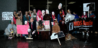 In Austin it rained on Iraq Moratorium Day, but it didn’t keep the Movement for a Democratic Society/Austin from “bringing out the dogs.” Some 50 demonstrators dressed in dog costumes, many with legitimate canines in tow, joined in a lively bit of street theater outside the downtown Austin offices of Sen. John Cornyn, the conservative Republican senator from Texas, from 5-6:30 p.m. Friday, Feb. 15.