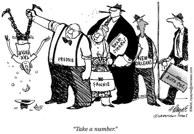 Who’s taking away people’s homes right now in the foreclosure frenzy? Not government. Well, not unless we remember that government could have done a better job reining in mortgage lenders and Fannie and Freddie. If indeed government is responsible for this mess, its fault was inaction. Finally, in the present crisis, government sees itself once again as the solution.