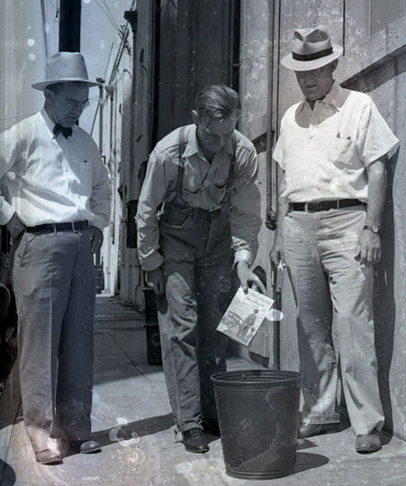 Pruett had never read the novel, but he had heard a radio program about it that made him angry, and so he readily agreed to take part in what Wartzman describes as a “photo op.” The photo shows Camp and another leader of the Associated Farmers standing by as Pruett holds the book above a trash can and sets it on fire.