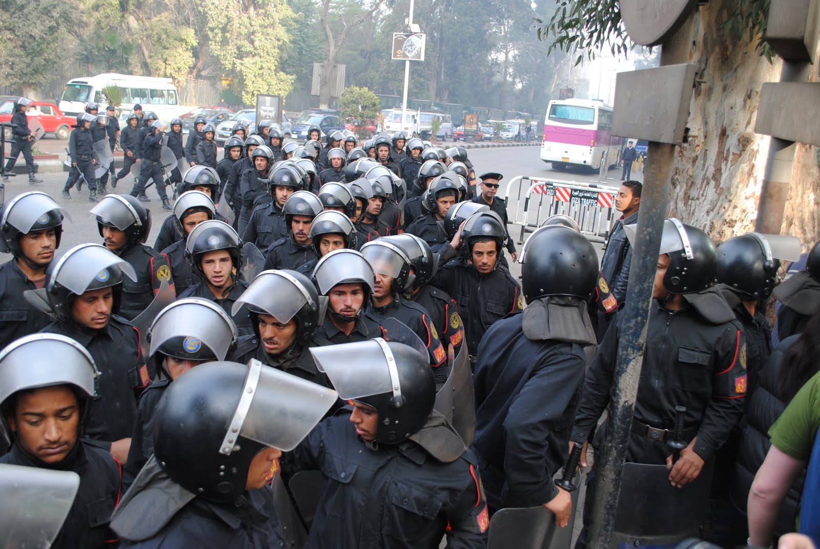 CAIRO — Egyptian security forces were attacking protesters in Tahrir Square, at the core of downtown Cairo, after they sat down in the middle of a busy Cairo street, protesting the imprisonment of the people of Gaza. Others were literally barricaded inside their hotel, the entrance surrounded by steel riot barriers. Egyptian security forces refuse to allow them to leave. Green personnel carriers line the streets. It is pandemonium.
