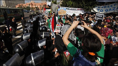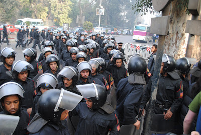 Cairo riot police confront Gaza Freedom March. Top photo from AP. Bottom photo by Brandon Delyzer from rabble.ca.