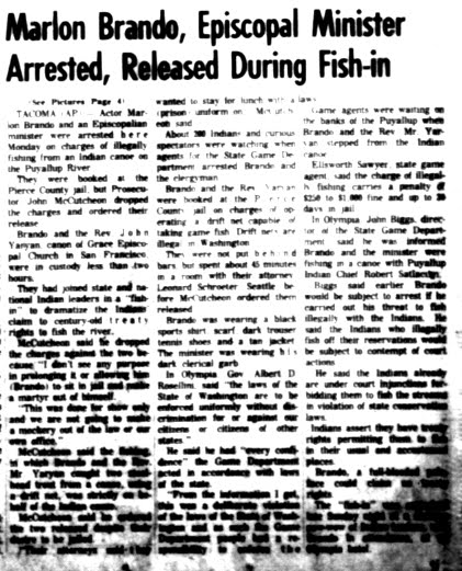 By 1964, the Native American cause had attracted the interest of another celebrity. On March 2 the NIYC gained national attention as actor Marlon Brando joined a Washington state fish-in. Already an outspoken supporter of the civil rights movement, Brando’s very public support and subsequent arrest for catching salmon “illegally” in Puyallup River helped to boost the Native movement.
