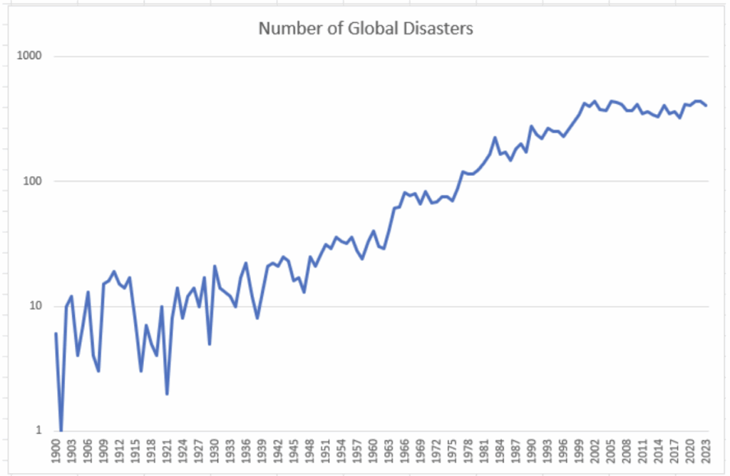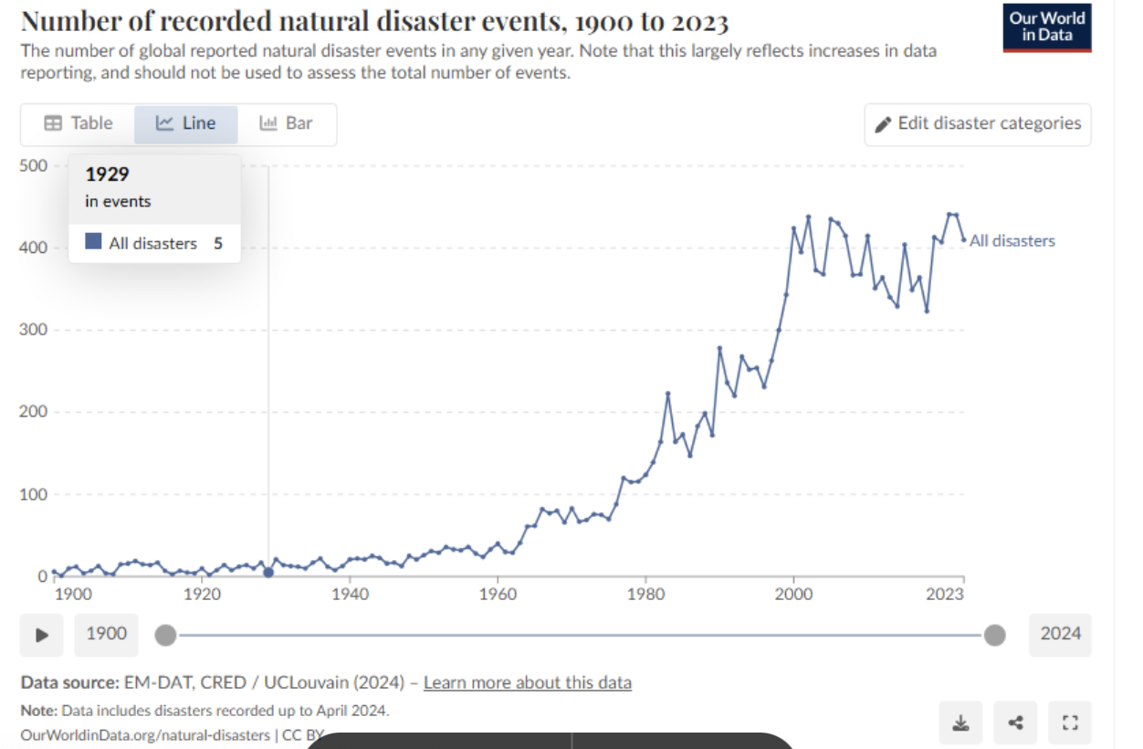 Ritchie and Rosado 2024 – Is the number of disasters increasing – Evaluation of the stark increase in disaster numbers since 1980… This “explainer” for Our World In Data, cautions that the number of reported disaster evident in the radically increasing number of disasters portrayed by International Disaster Database (EM-DAT), Centre for Research on the Epidemiology of Disasters (CRED), is biased by reporting that began rapidly increasing around 1980.