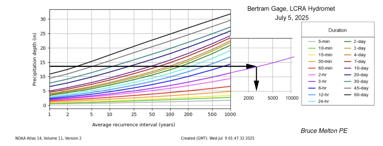 LCRA Hydromet, Bertram gauge, July 5, 2025 13.3 inches in 3:00 hours