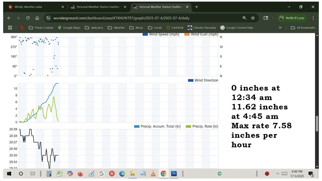Wunderground, KTXHunt97 gauge, July 4, 2025 11.62 inches in 4:06 hours