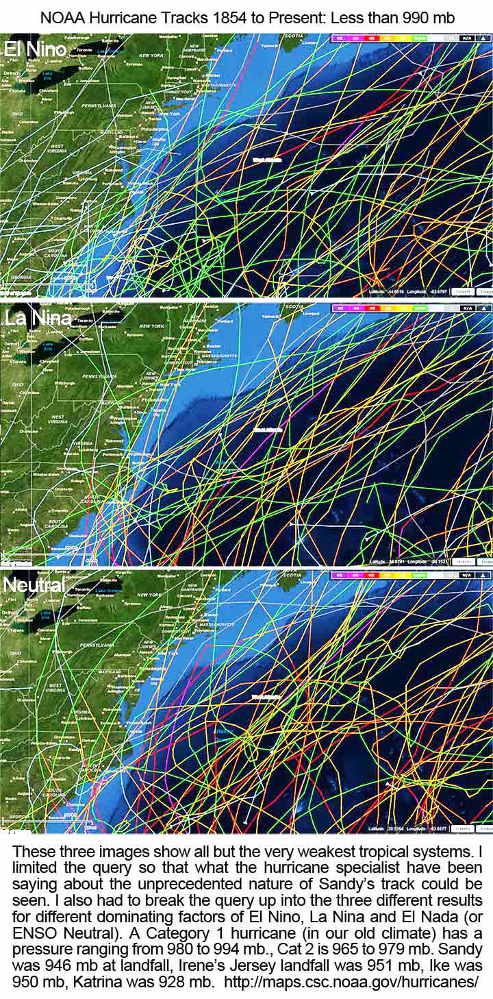 This is what caused our little superstorm to take that unprecedented left turn over Jersey. If it were not for that blocking high, Sandy would have followed the traditional path that every single hurricane ever tracked in the region has followed — it would have veered right, away from land out into the North Atlantic. NOAA’s hurricane paths are shown farther below to substantiate this large statement made by meteorologists.