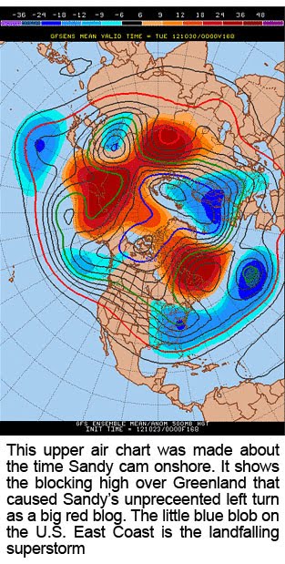 The big blocking high over Greenland, caused by the extra warmth in the Arctic created by the twice-record smashing low Arctic sea ice melt this year, was what forced Sandy to move inland as it mated with the Nor’easter spawning this climate change superstorm.