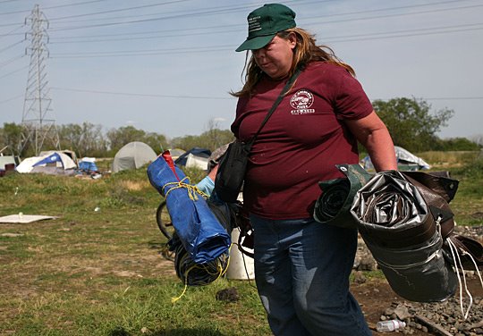 John Kraintz (top), who is homeless, was part of the procession that began at Loaves & Fishes in Sacramento. Photo by Lezlie Sterling / Sacramento Bee. Karen Hersh (below), a homeless woman, carries her belongings at the tent city in Sacramento. She and hundreds of other residents living in the tent city along the American River were issued notices of eviction by Sacramento police. Photo by Justin Sullivan / Getty Images.
