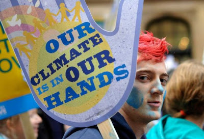 The center itself is divided into floors where the big decisions are being made, and then the rest of the place for the little people, the delegates from unimportant countries like Tuvalu, representatives of small NGOs and other riffraff. Many of the folks involved with the process inside are dividing their time between the meetings and events outside in the streets and at the alternative conference going on elsewhere in town.