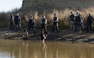 El 4 de septiembre, una agencia de seguridad privada, empleada por la compañía de construcción, agredió a un grupo de indígenas durante una ceremonia pacífica. El 28 del mismo mes, blindados llegaron a la planicie, la Policía antimotines apuntó sus rifles a manifestantes pacíficos, algunos a caballos, y arrestó a 21 de ellos. Fueron detenidas casi 100 personas, incluyendo al presidente Archambault y al consejero Dana Yellow Fat.