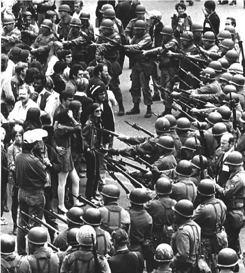 I plopped down onto the sidewalk in the first row of cross-legged protestors, eye-level with the shin-guards of the first row of National Guardsmen. My hair dropped down my back in a braid, and I was wearing a shirt made of an Indian-print bedspread. The blonde next to me leaned over and disclosed that she was on acid, in fact that she took acid every day.