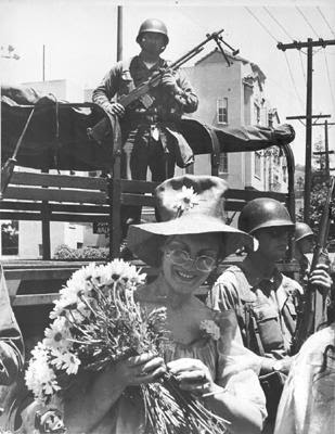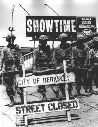Another photo appeared in that article about the rabble-rousers in Berkeley: a helicopter soaring between the Campanile and Sproul Hall dropping toxic CS gas into the plaza like it was Vietnam. Down at ground level people were screaming, fainting, falling down, blinded, retching, and the National Guard was advancing into the crowds cracking skulls with their batons.