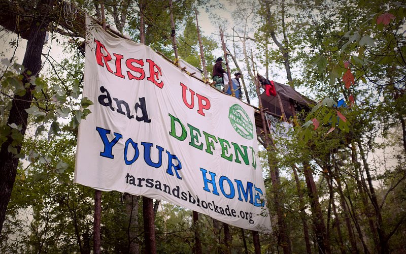 Nine protesters, surviving on canned food and bottled water, have been carrying out a tree-sit for more than two weeks to block the path of the pipeline near Winnsboro, Texas. Other Occupiers have chained themselves to logging equipment, locked themselves in trucks carrying pipe to construction sites and hung banners at equipment staging areas.