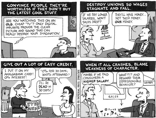 While people can resist the cheap-stuff propaganda and not worship at Wal-Mart, Ikea, and other big-box cathedrals—and stay out of the path of a mob of fundamentalist consumers—it is difficult to protect oneself from the slow death caused by consumer culture. Human beings are every day and in numerous ways psychologically, socially, and spiritually assaulted by a culture which: