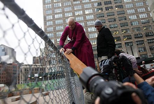 Bishop George Packard climbs a fence along with other protesters. Photo from Getty Images.